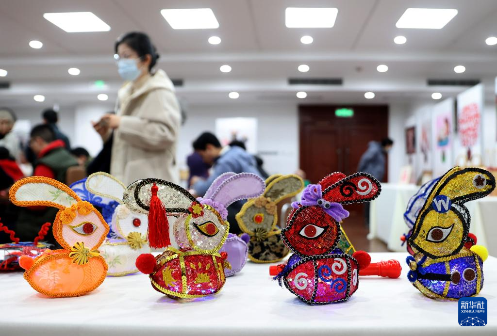 3月6日在巾帼园的非遗好物市集上拍摄的手工兔子灯。