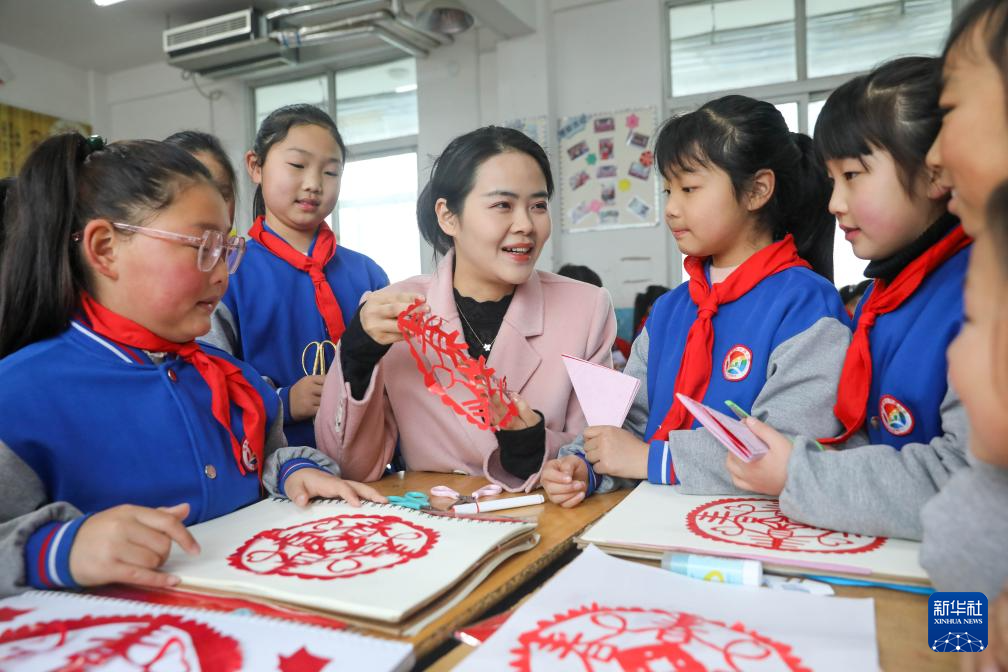 3月7日,河南省宝丰县山河路小学的老师在教学生剪纸。