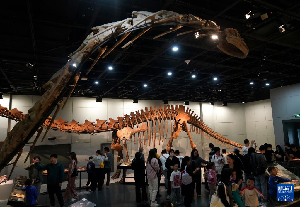 3月24日,人们在浙江自然博物院观看恐龙化石。
