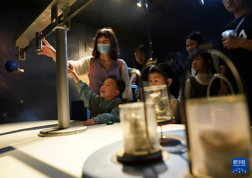 3月24日,家长带着孩子在浙江自然博物院感受陨石的重量。