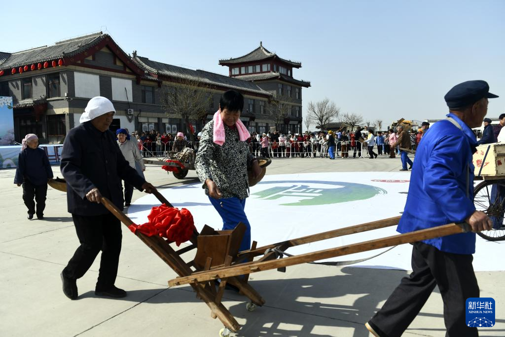 4月4日,水落坡镇乡村社火队队员在演绎鲁北乡村的播种场景。