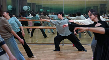 在柳州市鱼峰公园,市民和游客在庆祝“三月三”活动中一起跳竹竿舞(4月8日摄)。