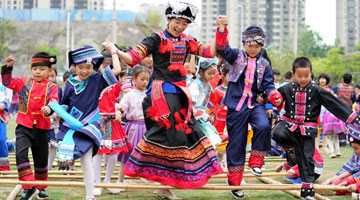 在柳州市柳江区进德镇中心幼儿园,老师和小朋友们在庆祝“三月三”活动中体验民俗活动(4月9日摄)。