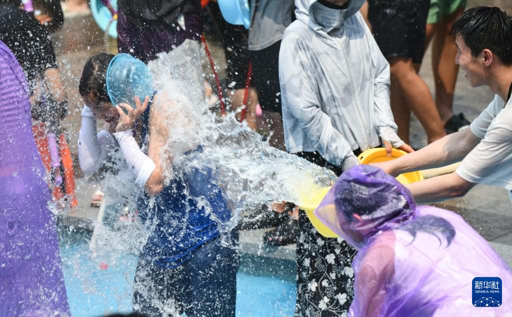 当日,云南省西双版纳傣族自治州举行泼水狂欢活动,人们欢聚在景洪市泼水广场,用相互泼水的方式互送祝福,庆祝泼水节。