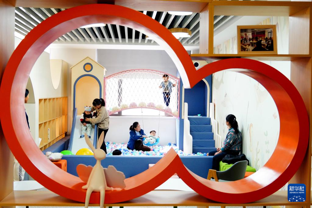 4月14日,在菏泽市巨野县凤凰社区党群服务中心儿童游乐区,家长在陪护孩子游玩。