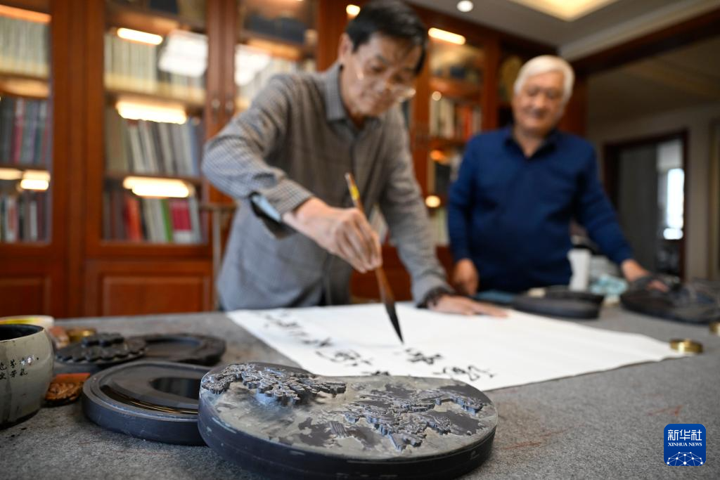 闫森林的好友、书法家陈国鸿(左)在书房练字,他常用的砚台是贺兰砚(4月15日摄)。