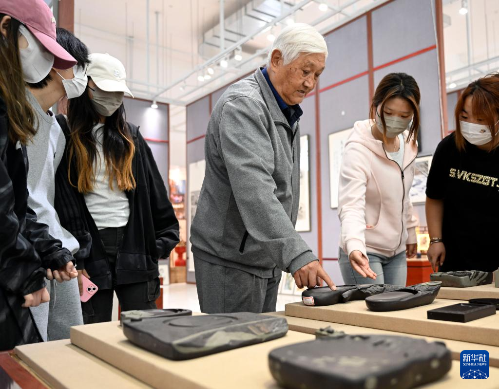 闫森林(中)在给宁夏艺术职业学院学生介绍贺兰砚作品(4月15日摄)。