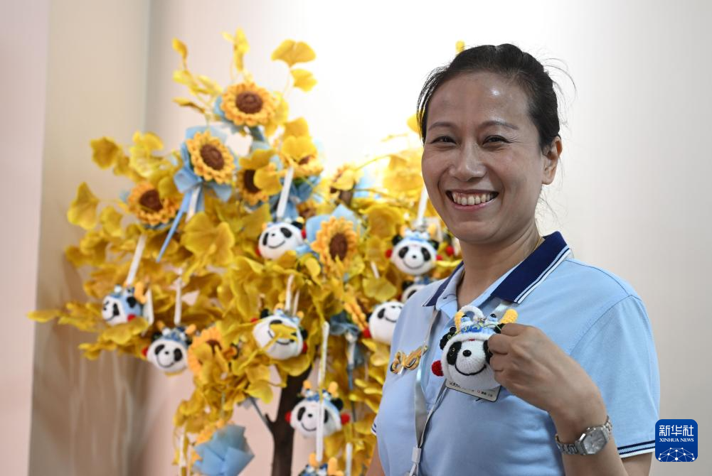 5月12日,“美丽工坊”项目残疾女性代表唐占鑫展示绒线钩织玩偶。