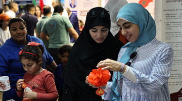 5月11日,参观者在希腊雅典扎皮翁宫使用VR眼镜欣赏中国石窟艺术。