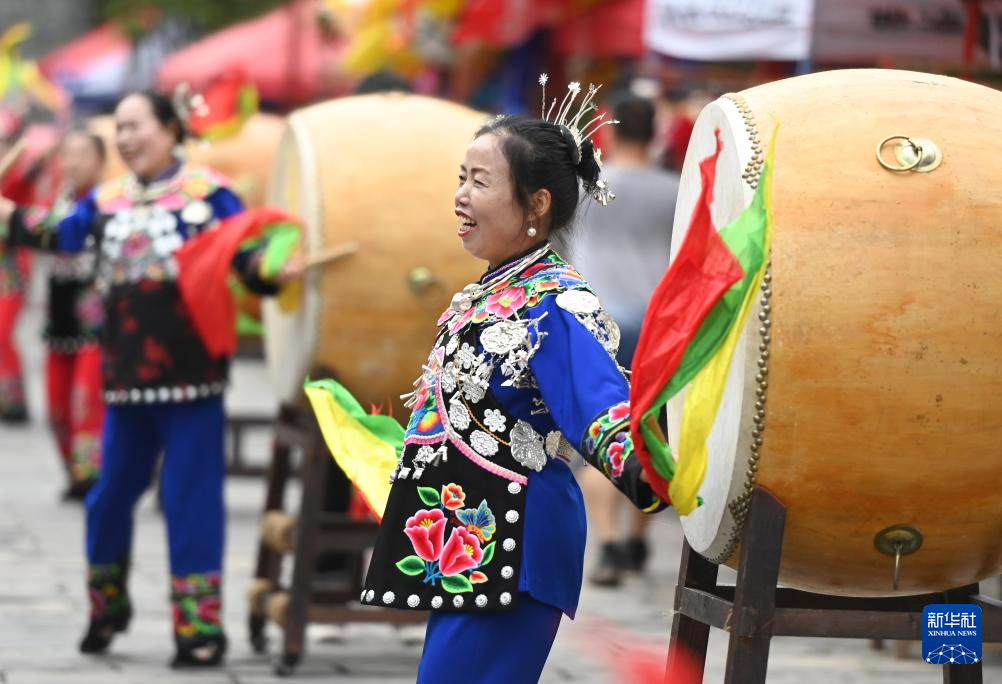 5月15日,在贵州省铜仁市松桃苗族自治县正大镇苗王城景区,苗族同胞在打花鼓。