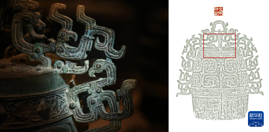 拼版照片,左图:秦公镈(一号镈)“扉棱”上龙纹与凤鸟纹装饰局部(2024年1月23日摄);右图:左图画面在镈身位置示意图(红框内)。