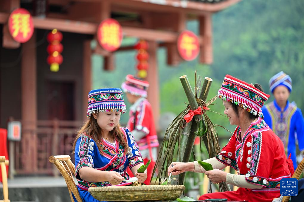 6月10日,云南省文山壮族苗族自治州文山市旧城村的苗族群众参加包粽子比赛。