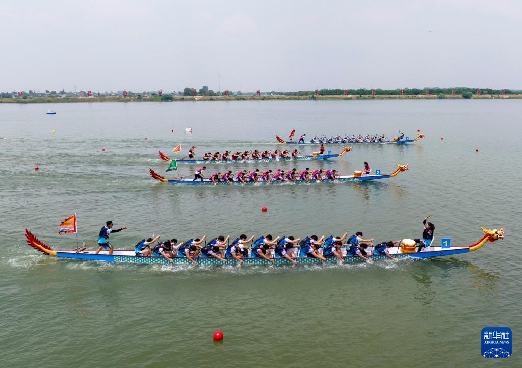 6月10日,在江苏省泰州市水上运动训练基地,人们进行龙舟竞渡(无人机照片)。