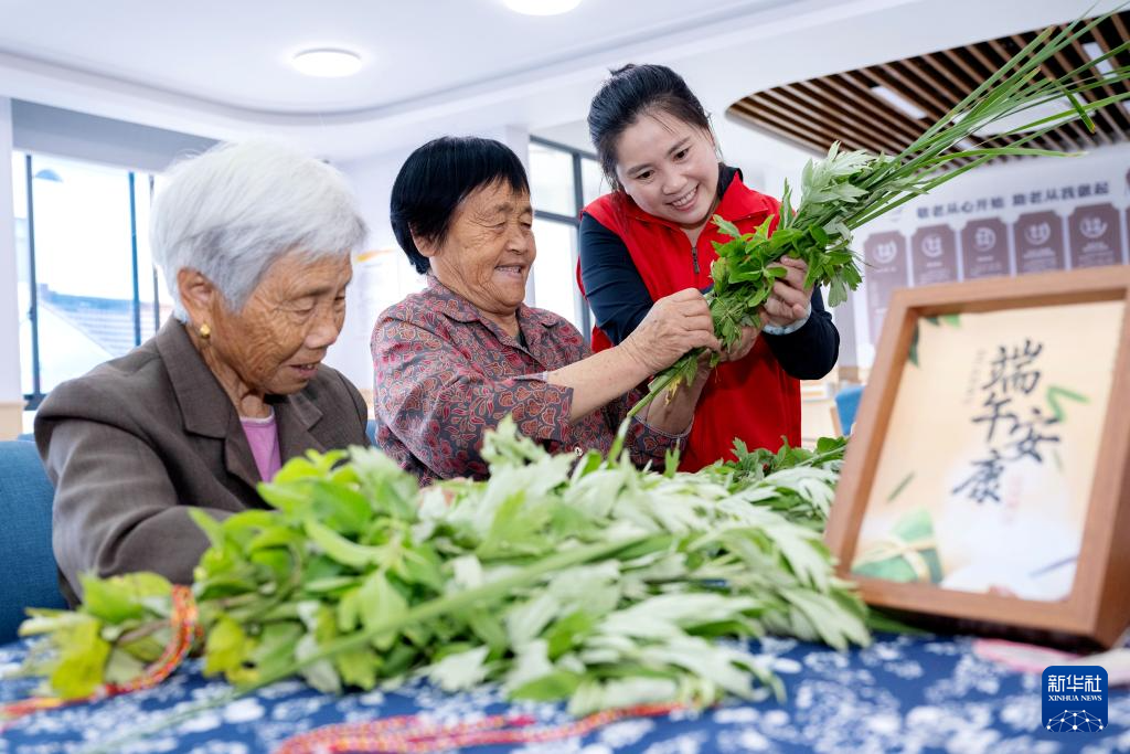 6月8日,在浙江省湖州市长兴县小浦镇中山村文化礼堂,青年党员与老人们一起插艾草。