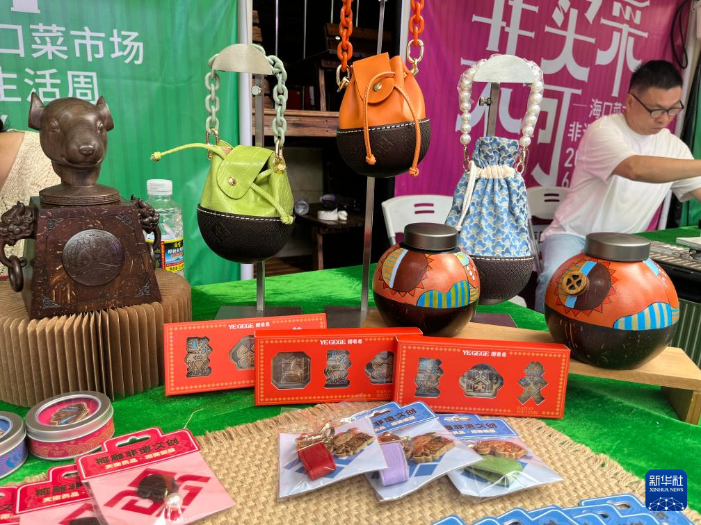 6月10日在海口市文华菜市场举办的菜市场非遗生活周活动上拍摄的椰雕工艺品。