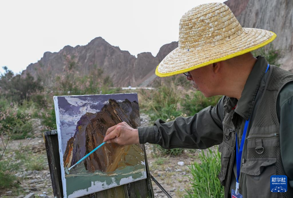 7月4日,在新疆克州阿图什市周边,小分队文化志愿者在写生创作。