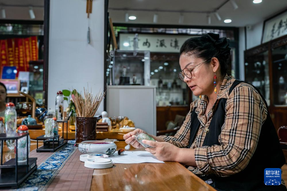 孙鸿雁在位于昆明官渡古镇的滇派内画传习馆内进行内画创作(7月3日摄)。