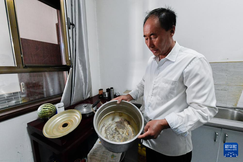 7月16日,张吉全和闻春瑜在厨房洗菜和面准备做饭。