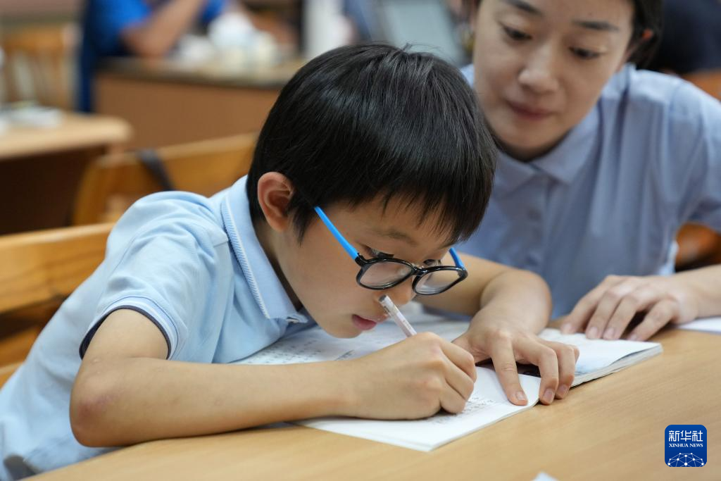7月29日,在位于杭州的浙江图书馆曙光路馆,一名小朋友在大人陪伴下做作业。