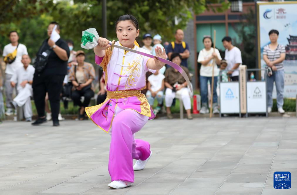 9月8日,一名武术爱好者在南川楼文化街区表演刀术。
