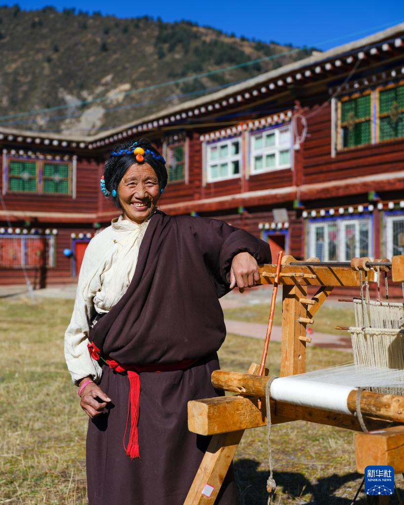占珠站在老式织机旁(11月3日摄)。在四川省甘孜藏族自治州德格县麦宿镇,娜叶家族中的女性以精湛的编织技艺著称。她们利用牦牛绒、羊绒等物编织出优质的氆氇等纺织品,深受当地居民喜爱。占珠于1960年出生于麦宿,是娜叶家族编织工艺的继承者和发扬者,是非遗项目“藏族牛羊毛编织技艺”四川省甘孜州代表性传承人。在女儿扎西曲措的帮助下,娜叶编织工坊的产品日益丰富,在传承家族古老技艺的同时,带动周边乡亲共同致富。