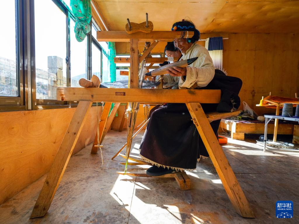 占珠(前)在娜叶编织工坊使用老式织机制作氆氇(11月3日摄)。在四川省甘孜藏族自治州德格县麦宿镇,娜叶家族中的女性以精湛的编织技艺著称。她们利用牦牛绒、羊绒等物编织出优质的氆氇等纺织品,深受当地居民喜爱。占珠于1960年出生于麦宿,是娜叶家族编织工艺的继承者和发扬者,是非遗项目“藏族牛羊毛编织技艺”四川省甘孜州代表性传承人。在女儿扎西曲措的帮助下,娜叶编织工坊的产品日益丰富,在传承家族古老技艺的同时,带动周边乡亲共同致富。