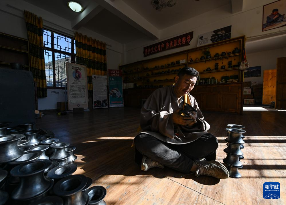 根呷火热展示制作的黑陶产品(11月3日摄)。在四川省甘孜藏族自治州德格县麦宿镇,根呷火热忙着制作成都一家餐饮企业的黑陶订单。今年39岁的根呷火热是四川省级非遗麦宿黑陶的传承人,也是麦宿当地黑陶工坊的创始人。捣土、塑形、风干、烧制……在传承与创新中,根呷火热不断钻研,让手工艺品从雪域深山走向省内外消费市场。