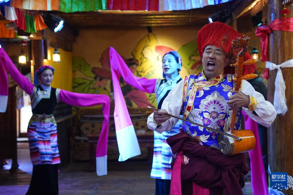 11月5日,在四川省甘孜藏族自治州巴塘县,王扎西在非遗传习体验馆表演巴塘弦子舞。在四川省甘孜藏族自治州巴塘县,人们时常跳起弦子舞,这是一种集诗、琴、歌、舞于一体的综合性表演艺术,领舞的弦胡手是表演是否成功的关键。弦胡,通常用柏木做琴筒,在琴杆顶部雕刻龙头宝塔。今年66岁的弦胡手王扎西是“巴塘弦子舞”的省级非遗传承人。为保护并传承弦子舞和弦胡制作技艺,王扎西在自己房屋里建起弦胡制作坊,并在各类活动中表演,展示弦胡的韵律和弦子舞的魅力。