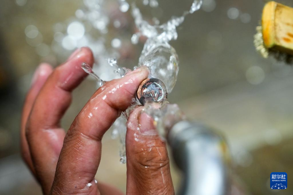 达瓦扎巴在冲洗初步铸造完成的利玛铜文创产品,准备对其进行精加工(11月3日摄)。达瓦扎巴1992年出生在四川省甘孜藏族自治州德格县麦宿镇一个手工艺家庭,其家族有约两百年制作利玛铜铸制品的历史。达瓦扎巴从小跟随父亲尼玛学习。如今,他已是非遗项目“藏族金属锻造技艺”四川省甘孜州代表性传承人。达瓦扎巴在继承传统工艺的同时,开发创作时尚文创产品,将藏族传统手工艺推向国际市场。目前,其家族的“钦乐工坊”有全职手艺人约40名。
