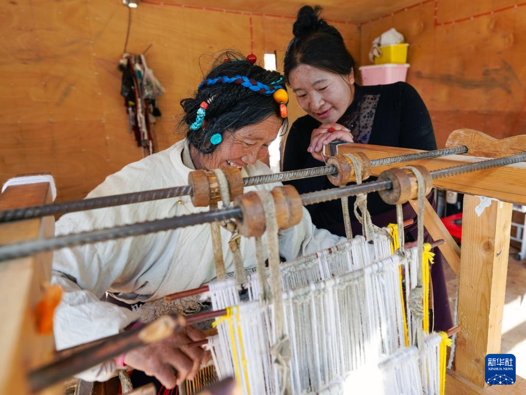在娜叶编织工坊,占珠(左)为学徒讲解制作氆氇的技艺(11月3日摄)。在四川省甘孜藏族自治州德格县麦宿镇,娜叶家族中的女性以精湛的编织技艺著称。她们利用牦牛绒、羊绒等物编织出优质的氆氇等纺织品,深受当地居民喜爱。占珠于1960年出生于麦宿,是娜叶家族编织工艺的继承者和发扬者,是非遗项目“藏族牛羊毛编织技艺”四川省甘孜州代表性传承人。在女儿扎西曲措的帮助下,娜叶编织工坊的产品日益丰富,在传承家族古老技艺的同时,带动周边乡亲共同致富。