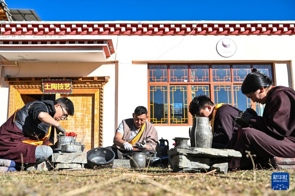 根呷火热(左二)和徒弟们一起制作黑陶产品(11月3日摄)。在四川省甘孜藏族自治州德格县麦宿镇,根呷火热忙着制作成都一家餐饮企业的黑陶订单。今年39岁的根呷火热是四川省级非遗麦宿黑陶的传承人,也是麦宿当地黑陶工坊的创始人。捣土、塑形、风干、烧制……在传承与创新中,根呷火热不断钻研,让手工艺品从雪域深山走向省内外消费市场。
