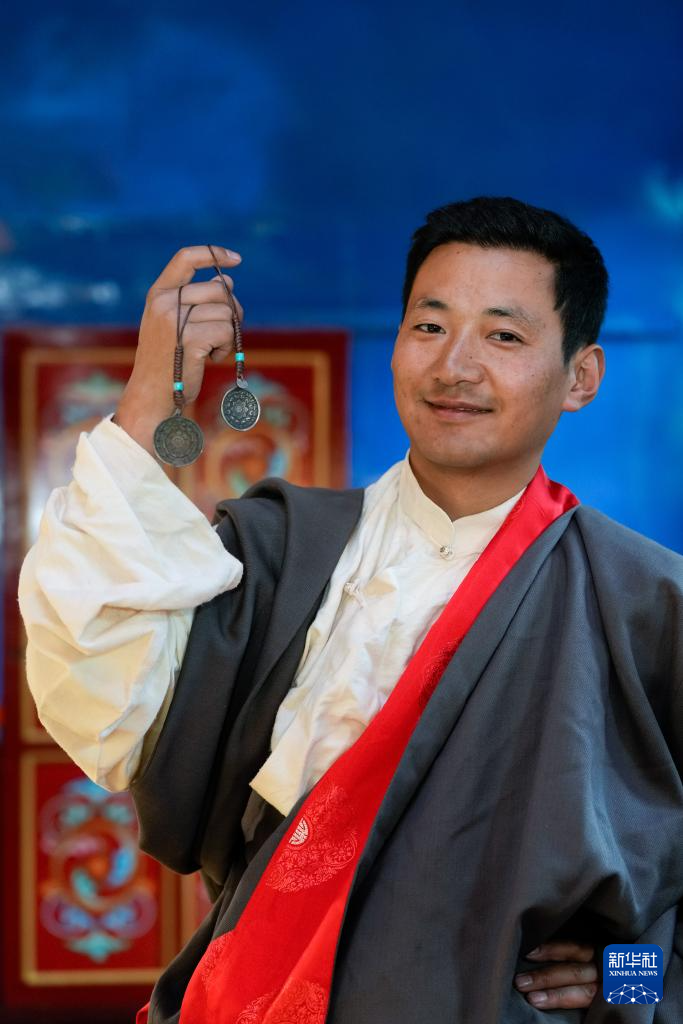 达瓦扎巴在展示“钦乐工坊”采用利玛铜铸造工艺制作的文创产品(11月3日摄)。达瓦扎巴1992年出生在四川省甘孜藏族自治州德格县麦宿镇一个手工艺家庭,其家族有约两百年制作利玛铜铸制品的历史。达瓦扎巴从小跟随父亲尼玛学习。如今,他已是非遗项目“藏族金属锻造技艺”四川省甘孜州代表性传承人。达瓦扎巴在继承传统工艺的同时,开发创作时尚文创产品,将藏族传统手工艺推向国际市场。目前,其家族的“钦乐工坊”有全职手艺人约40名。