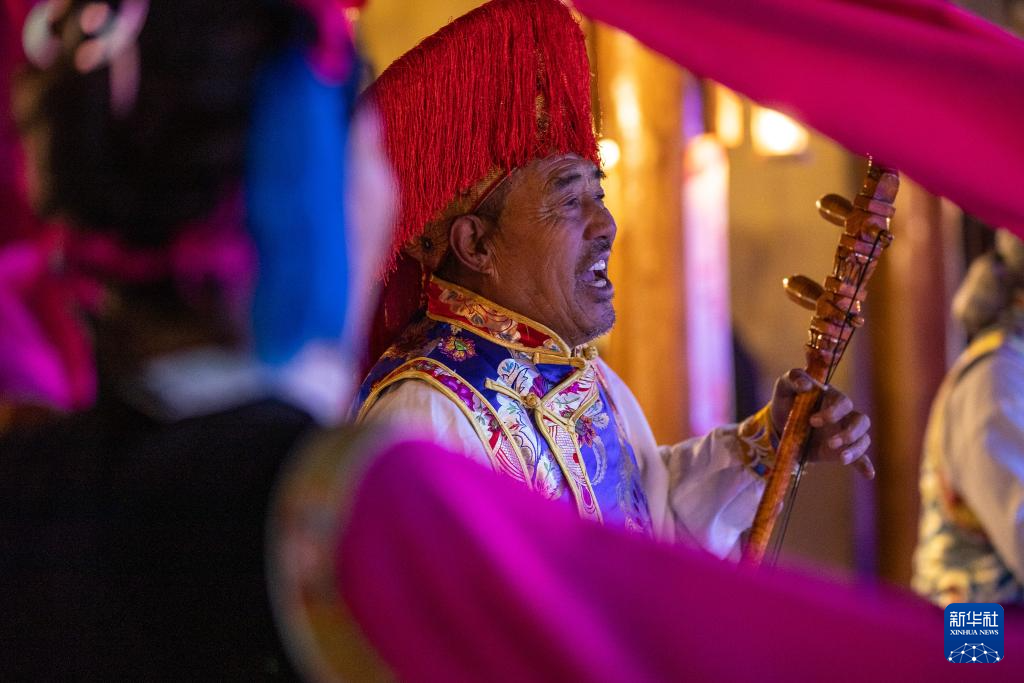 11月5日,在四川省甘孜藏族自治州巴塘县,王扎西(右一)在非遗传习体验馆表演巴塘弦子舞。在四川省甘孜藏族自治州巴塘县,人们时常跳起弦子舞,这是一种集诗、琴、歌、舞于一体的综合性表演艺术,领舞的弦胡手是表演是否成功的关键。弦胡,通常用柏木做琴筒,在琴杆顶部雕刻龙头宝塔。今年66岁的弦胡手王扎西是“巴塘弦子舞”的省级非遗传承人。为保护并传承弦子舞和弦胡制作技艺,王扎西在自己房屋里建起弦胡制作坊,并在各类活动中表演,展示弦胡的韵律和弦子舞的魅力。