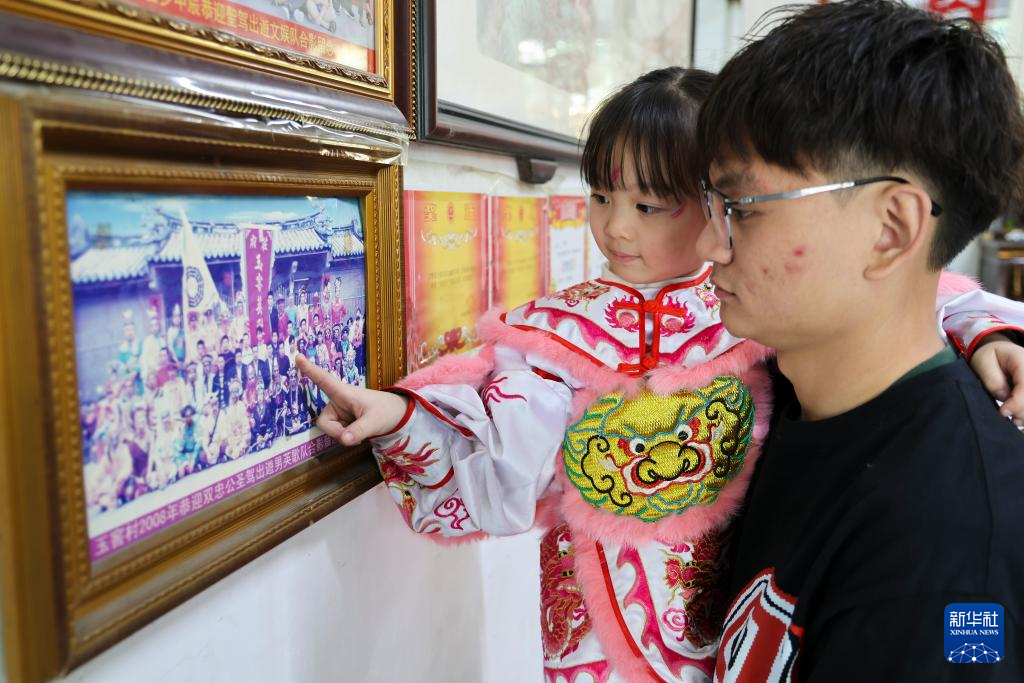 12月9日,爸爸抱着庄恩琪看爷爷2008年参加英歌队时的合影。