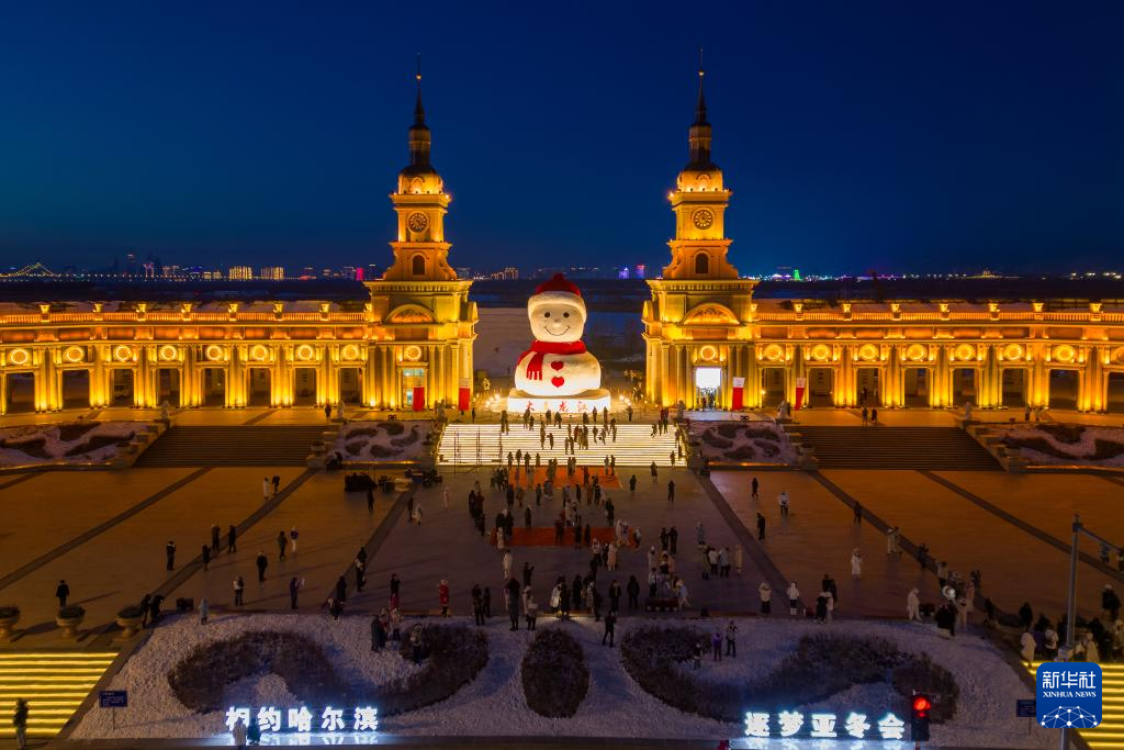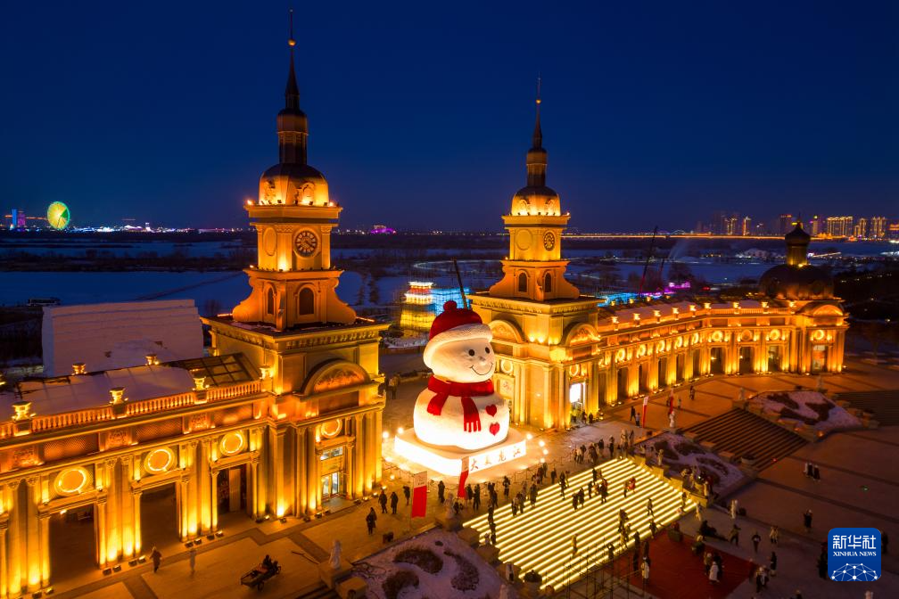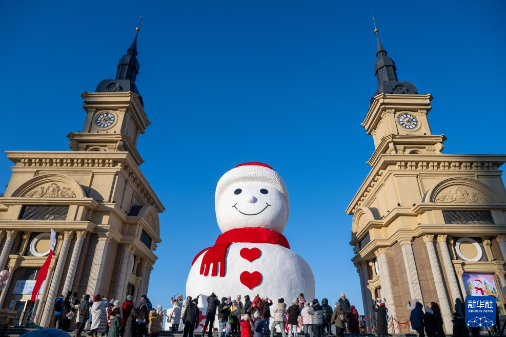 当日,哈尔滨“网红”大雪人“回归”松花江畔。