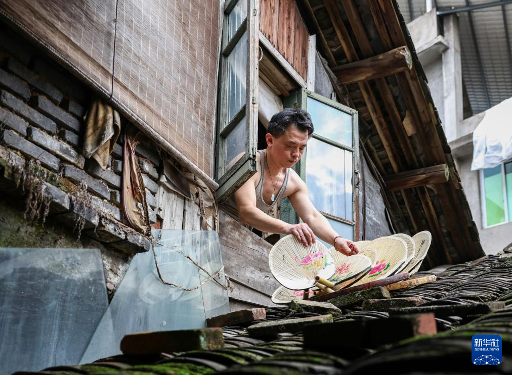 在宁德福安市官埔村,官埔油扇制作艺人林少殊在晾晒油扇(2024年6月25日摄)。