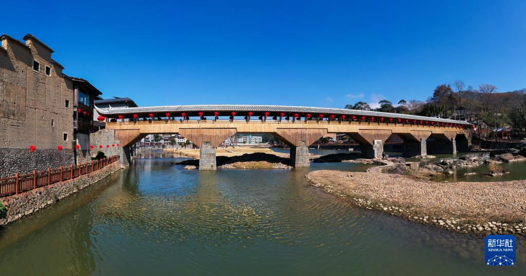 这是在宁德市屏南县长桥镇拍摄的修复后的万安桥(2024年1月23日摄,无人机拼接照片)。