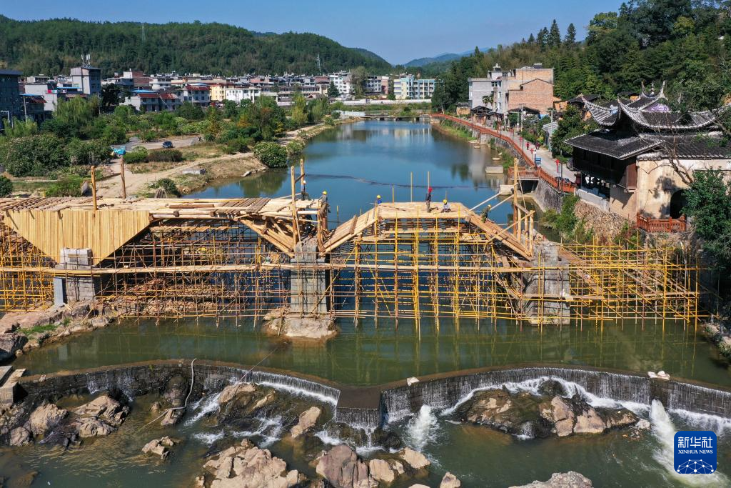 在宁德市屏南县长桥镇,工匠在修复万安桥时搭建廊桥桥台拱架(2023年10月18日摄,无人机照片)。