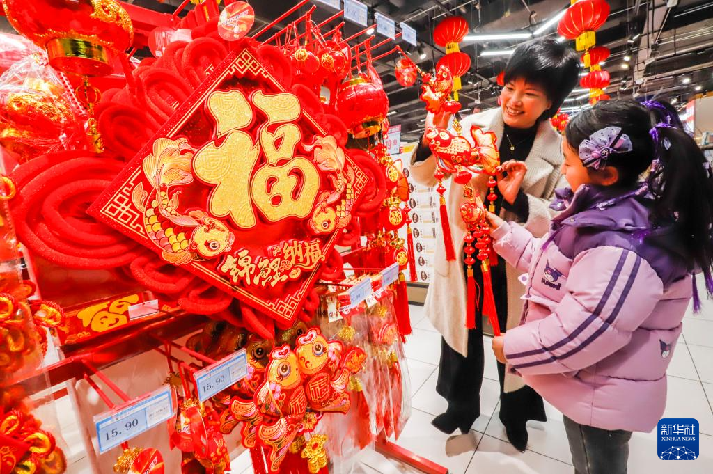 1月14日,市民在四川省达州市通川区珠市街年货市场选购春节饰品。