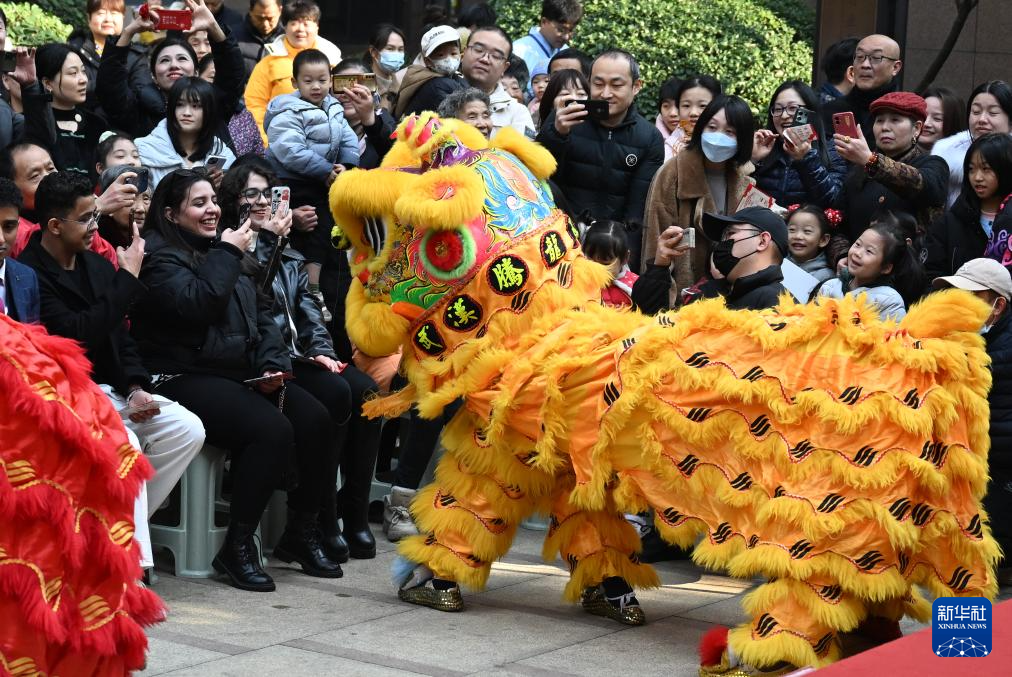 1月19日,小朋友在社区庙会上和舞狮互动。