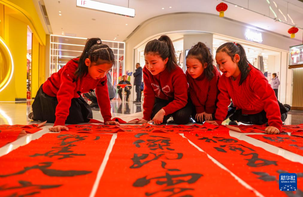 1月23日,在湖南省衡阳市衡东县文体广场,书法爱好者为群众书写对联、福字。