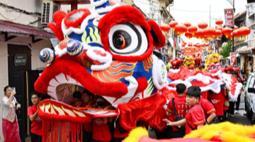 1月21日,在马来西亚马六甲市鸡场街,人们舞动“马中友谊瑞狮”,迎接新春 。