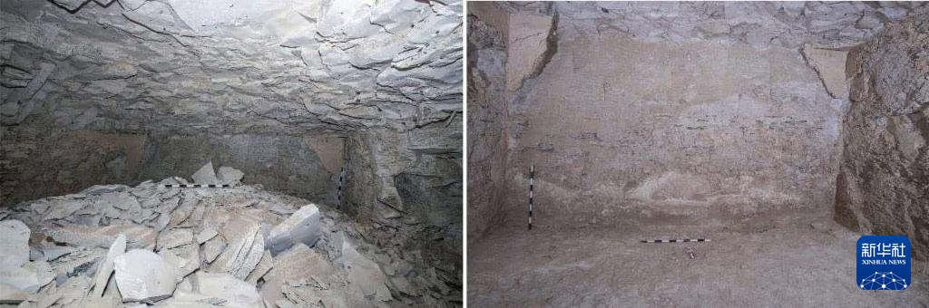 这张拼接的图像显示的是图特摩斯二世法老陵墓一墓室清理前后的景象。