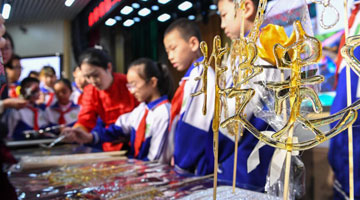 2月25日,两名土耳其观众在第十届伊斯坦布尔出版联谊会中国文化展区拍照留影。