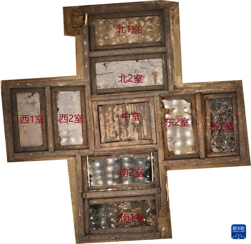 安徽淮南武王墩一号墓木椁室布局(周边盖板揭取后)(资料照片)。新华社发(国家文物局供图)