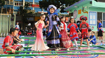 3月30日,身着传统服饰的姑娘在宣恩县椒园镇庆阳古街的茶园里翩翩起舞。