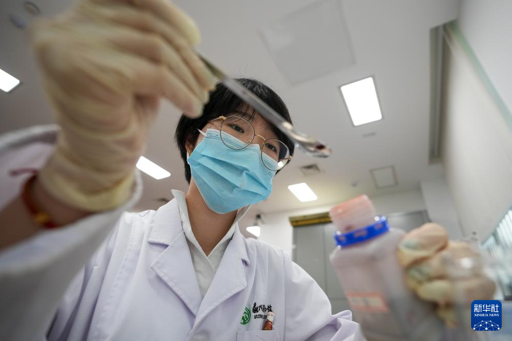 陈琰璐使用便携式显微镜对织物进行检测分析(5月18日摄)。