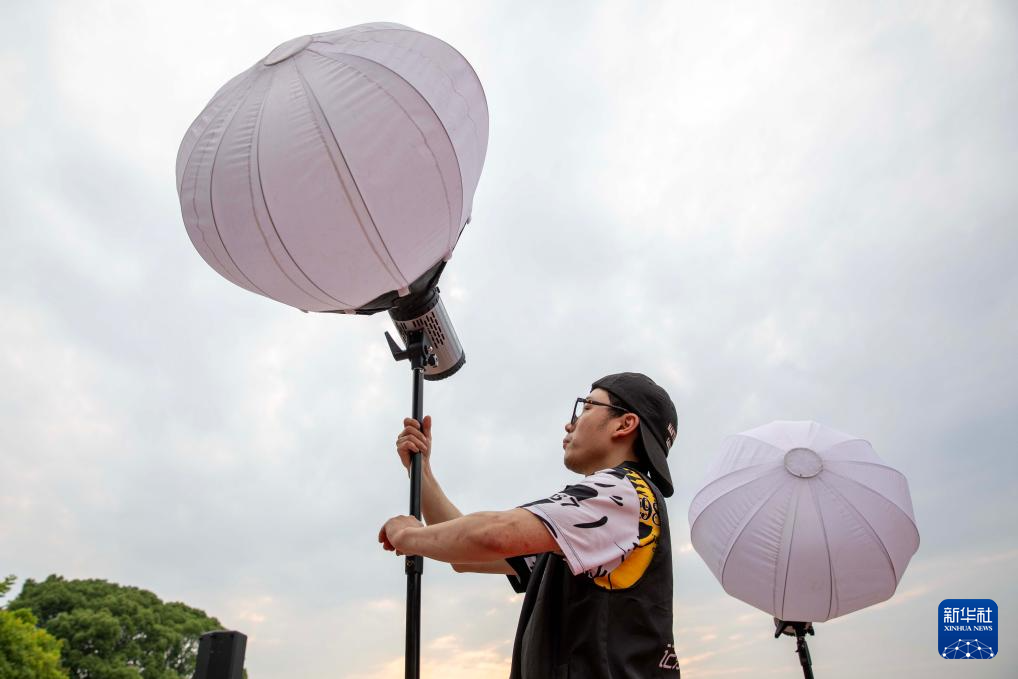 主播团队成员在温州市鹿城区帆影广场安装补光灯(5月24日摄)。