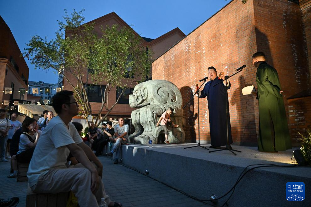 相声演员在天美艺术街区露天空间为市民表演(7月12日摄)。