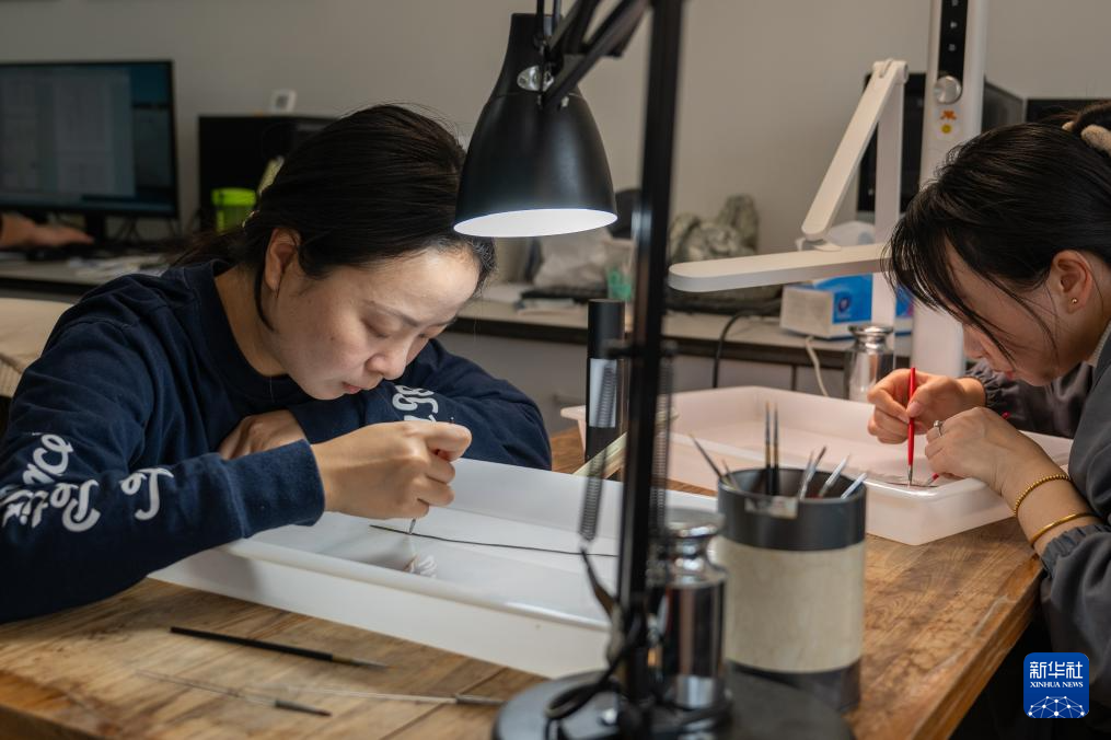 1月9日,在湖北荆州文物保护中心,工作人员对文物进行胎体修复。